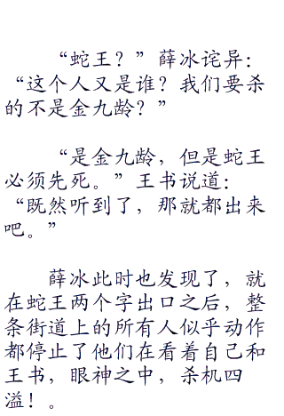 “不,杀人对我来说,只是一项娱乐活动而已。”王书说道:“杀金九龄不是目的。”