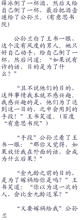 说话的不是薛冰,而是公孙兰,她是昨天被王书召唤到身边的,而且到了身边就不