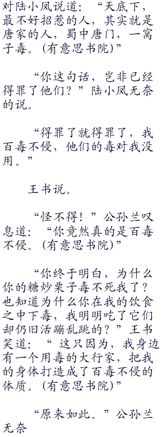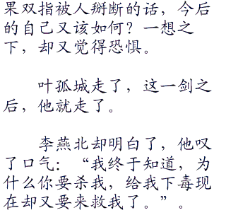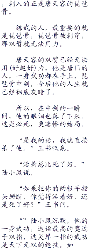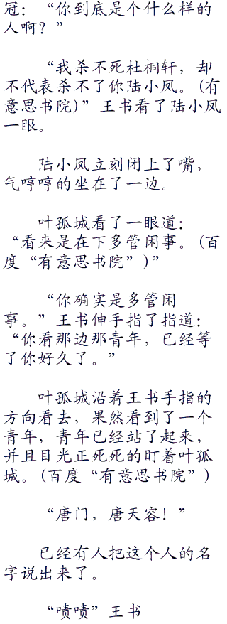 “但是一次出手,两人阻拦,再出手未免失了风度。”王书道:“既然今天他没死,以后再杀,那也是以后的事情了。以后的事情,不耽误我现在的难过和伤心。”