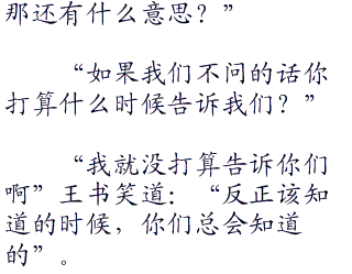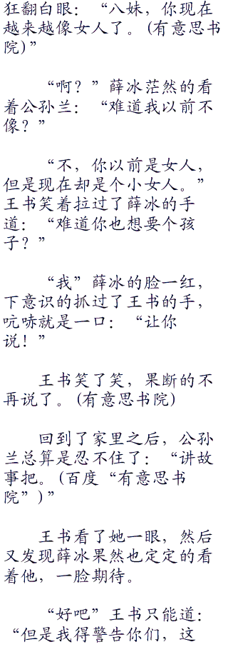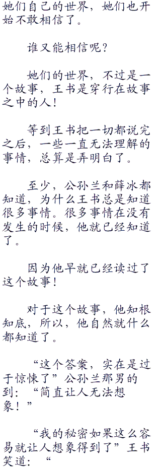 王书无语,这两个笨女人之所以笑的这么夸张,只是因为在刚才,陆小凤说他想知道那秘密的时候,王书简单的回了一句:“你想知道啊?你想知道我却不想告诉你。”