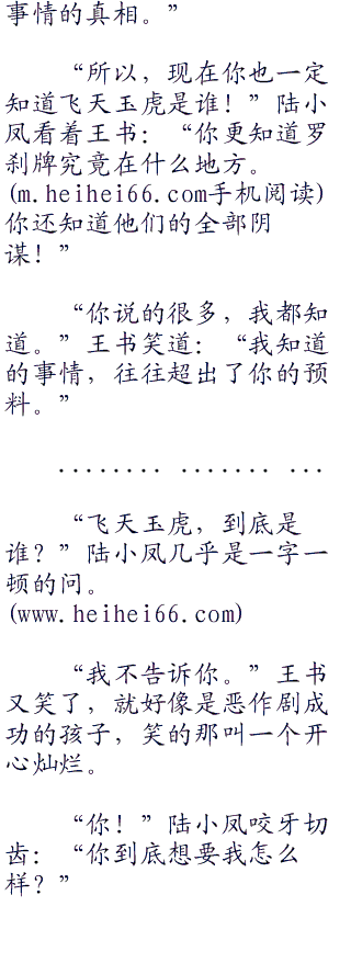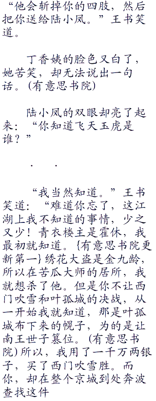 “我知道的事情,远远超出了你的想象。”王书笑:“所以如果我是你的话,现在就会自己抹了脖子,比较省事。”