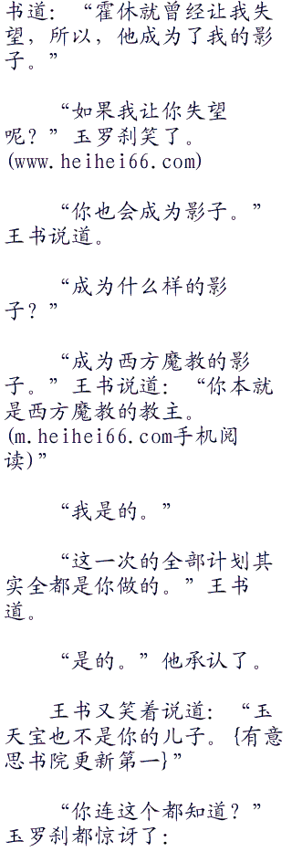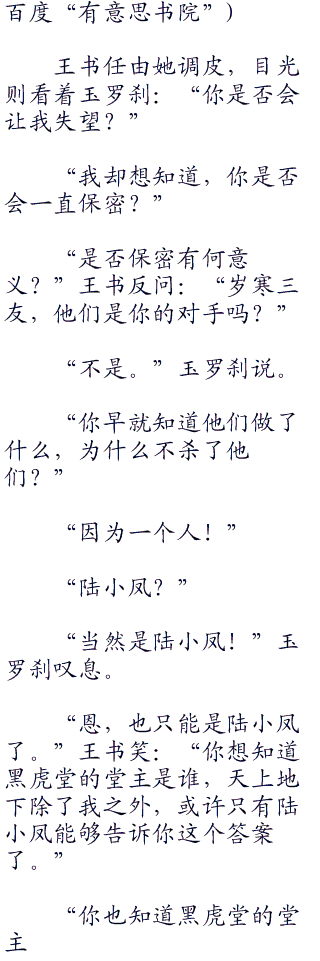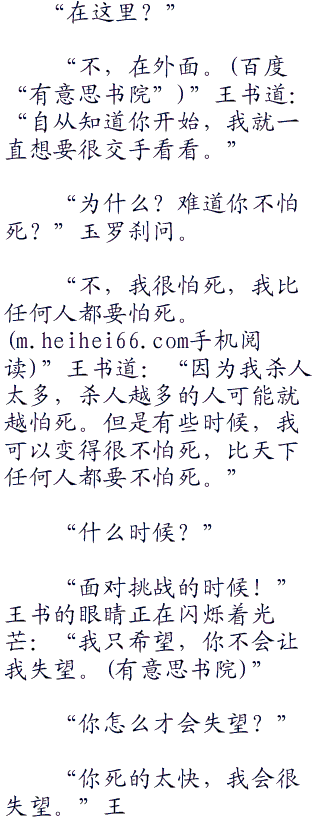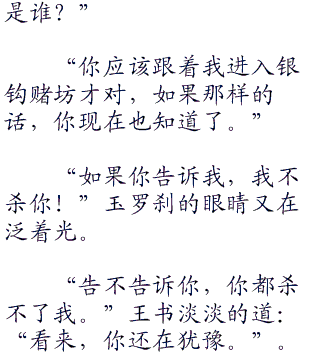 “你是王书?”玉罗刹开口了,声音很平淡,他的人其实长得也很平淡,唯有一双眼睛,那一双眼睛,几乎突破了人类对于眼睛的定义,那是一双超凡脱俗的眼睛,无法形容的眼睛。