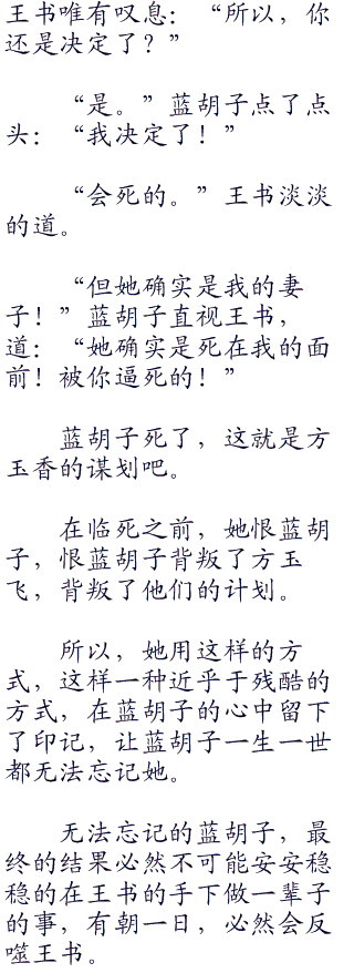 这暗室之中本就有很多人,最后一个人却是一个女人,她叫方玉香,据说是方玉飞的妹妹,蓝胡子的妻子。