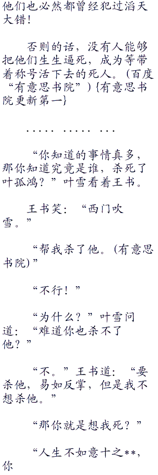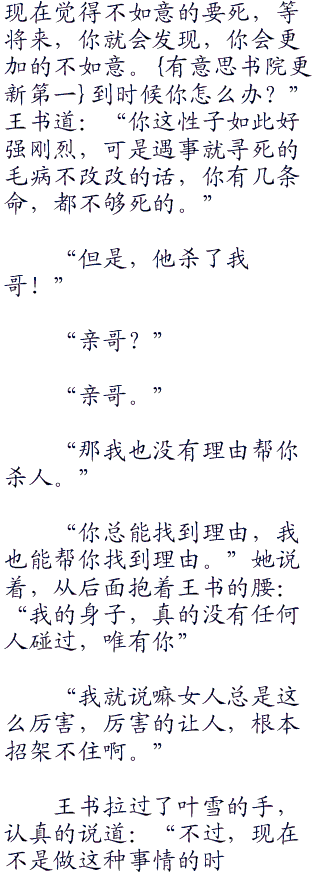 王书静静的看着他,他也静静的看着王书,半晌之后,老刀把子开口道:“非杀不可?”