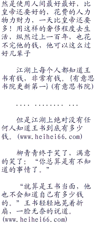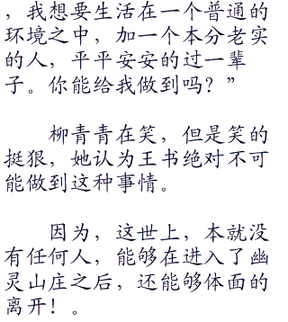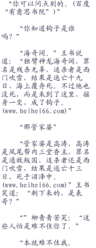 “我知道。”王书点了点头:“花寡妇,柳青青,淮南大侠女,点苍剑客谢坚之妻。罪名,通奸,杀夫。追杀者,西门吹雪,结果,逃亡十九日,死于荒漠中!但事实上,你却在这里。”