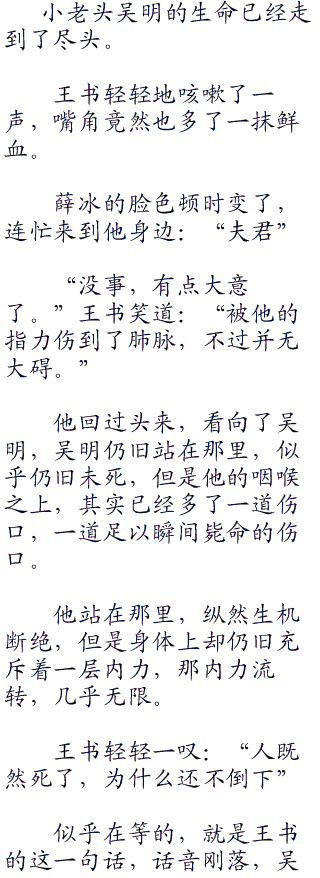 “小老头武功果然不凡。”王书笑着说道:“天下间,能够拥有你这一身内力者,估计为数不多。”