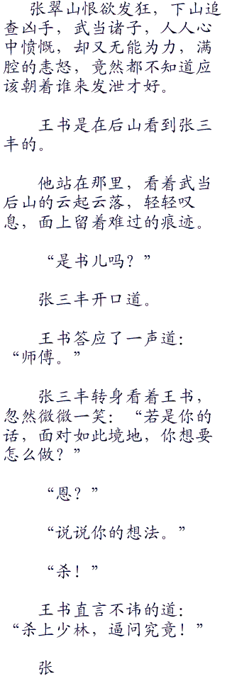倒不是说王书学不会,只是张翠山一趟下来,王书就已经把整套武功融会贯通了。却又不能明说,张翠山则不断的拆解招数,告诉王书哪一招哪一式其中又有如何精妙之处,又有如何独到之处,敌人攻来,他又应该如何变招抵挡等等等等