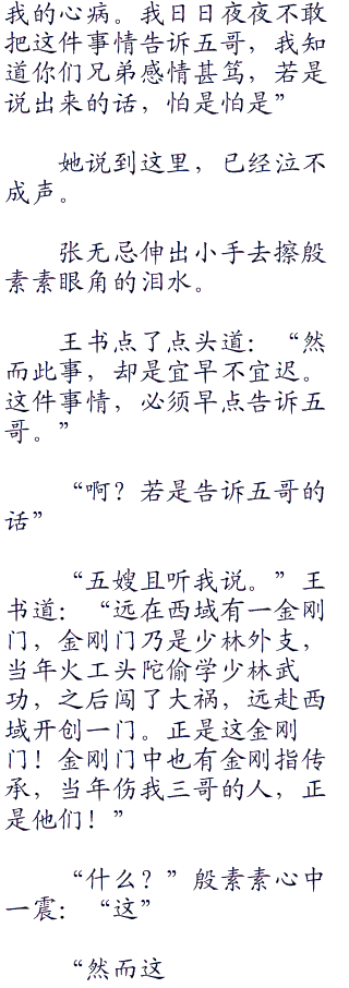俞莲舟看王书背影,有点无奈,对张翠山说道:“师傅曾经想给他说一门亲事,却是打死不干。师傅竟然也是纵容,你说,这婚姻大事,本就是父母之命媒妁之言,这小子,却偏偏要提什么自由恋爱?你说这,哎”