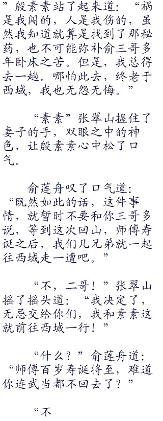 殷素素擦干眼泪,连忙道:“我明白了,我这就和五哥分说明白,然后远赴西域,去寻找那疗伤秘药。只要找到拿回来交给俞三哥,哪怕,哪怕他就是杀了我,我也,我也甘心赴死!”
