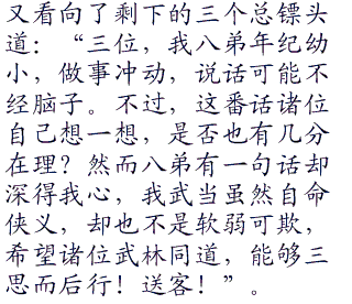 就正好听到,那门内一大汉大声说道:“祁某今日到武当山来撒野,天下武学之士,人人要笑我班门弄斧,太过不自量力。可是都大锦都兄弟满门被害十年,沉冤始终未雪,祁某这口气终是咽不下去,反正武当派将龙门镖局七十余口也杀了,再饶上祁某一人又何妨?便是再饶上金陵虎踞镖局的九十余口,又有何妨?祁某今日血溅于武当山上,算是死得其所。我们上山之时,尊重张真人德高望重,不敢携带兵刃,祁某便在莫七侠拳脚之下领死。”