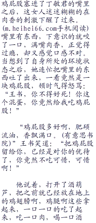 他哼哼着,把手里的野鸡烤的浑身冒油,然后撕下了鸡翅膀,鸡腿,鸡胸脯,鸡脖子等各处的肉,然后大快朵颐的吃了起来。剩下肋巴叉子,鸡屁股之后,他住了口,然后扔给了丁敏君。