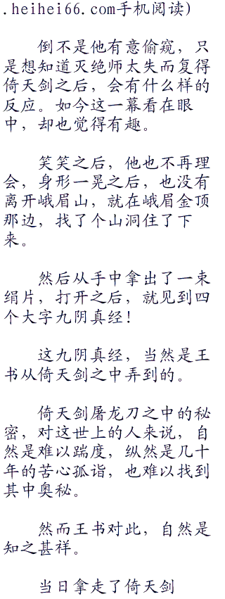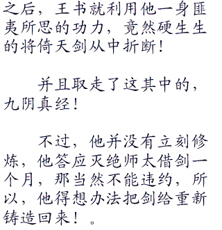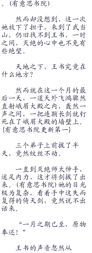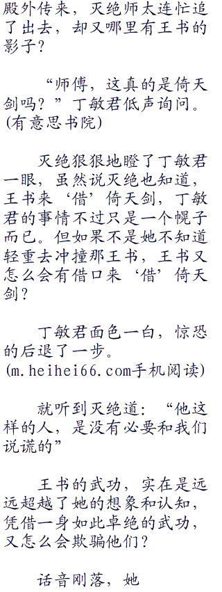 王书淡然一笑,然后若有所思的看了灭绝师太一眼道:“若是我将这倚天剑毁了,不知道师太是否会和在下拼命?”