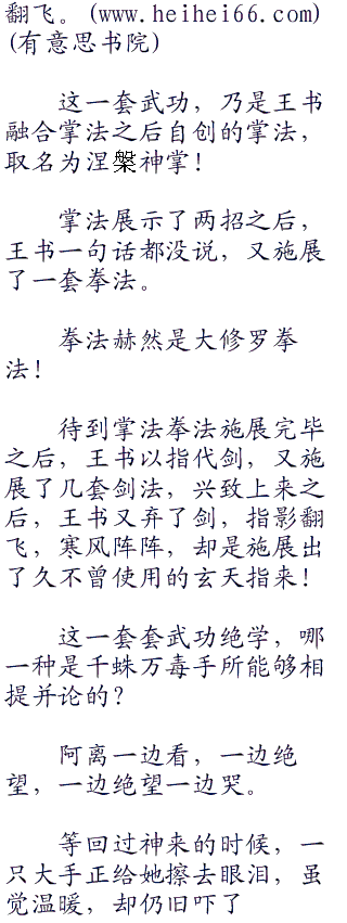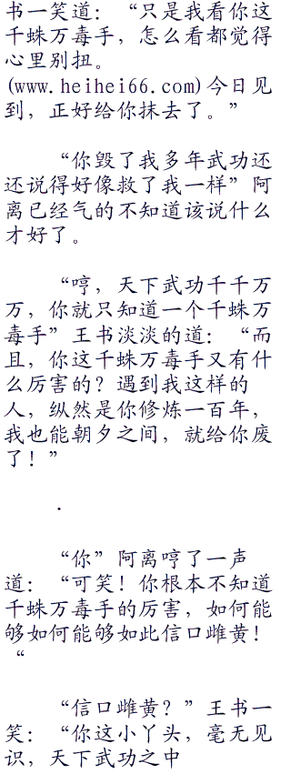 等到王书收掌,阿离这才下意识的摸了摸自己的脸,继而绝望的道:“你,你毁了我多年修炼的千蛛万毒手!?我,我和你拼了!!!!”