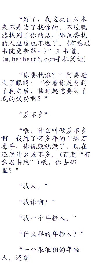 “和我没有关系,你会教我武功?”阿离狠狠地瞪着王书:“我告诉你,不管你有什么目的,你都找错人了。我恨你,我恨你毁了我的千蛛万毒手,我恨你一辈子!”