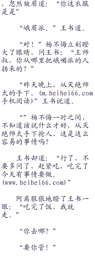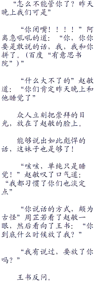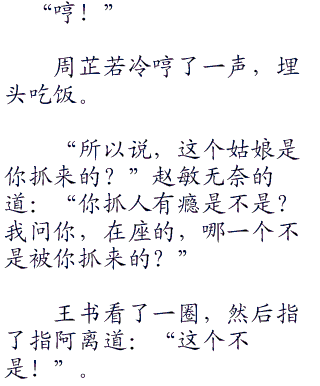 “你!”周芷若这一生何曾遇到过这样的人?她是峨眉派的高徒,行走江湖的时候,谁都给她三分面子,谁又敢对她这么说话?这世上无耻的人自然也有,但是和王书却又截然不同。