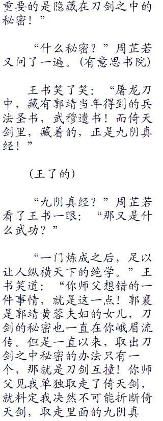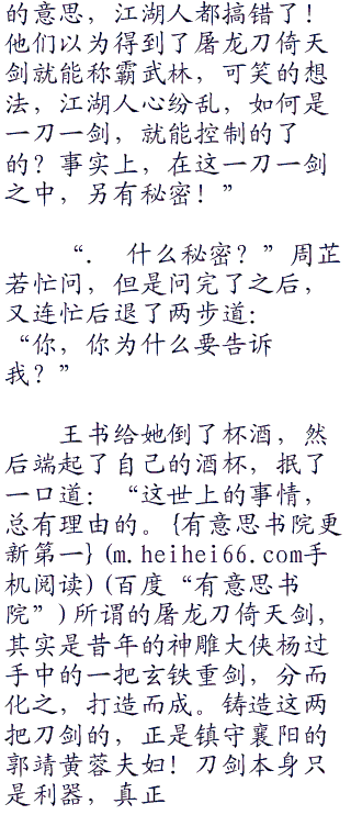 “说起这个,我们就说说倚天剑吧。”王书道:“你知道我为什么要取走倚天剑吗?”