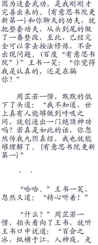 周芷若心中凛然,只觉得王书口中所说的诀窍,全都是武学之中的不传之秘,却又不知道,这门内功又是什么道理?
