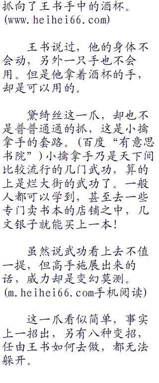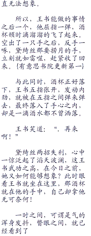 他笑着看向黛绮丝道:“三招,如果三招之内,你能够让这杯中酒水洒出一点,就算我输!任由你如何出招,我都是坐在这里,身体不会动弹一下,另外一只手也绝不会用,只会用这一只手和你周旋!”