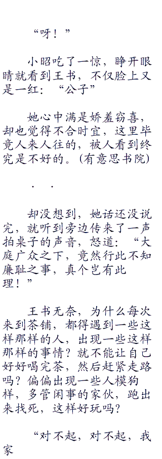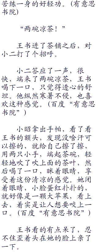 山脚下,茶铺旁,小昭擦了一把汗,对王书道:“公子,休息一下吧?好累,我走不动啦!”