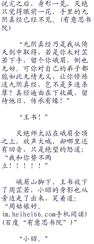 “又有什么好说的。”灭绝师太冷笑一声道:“我武功不如你们,要杀就杀,但是你们这对狗男女,也休想能够得到善终!”