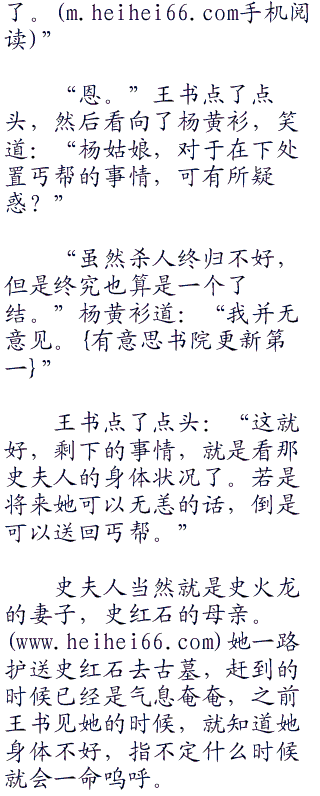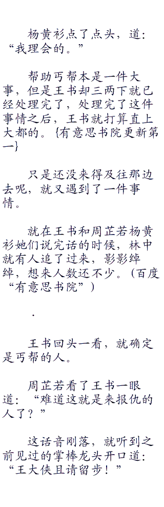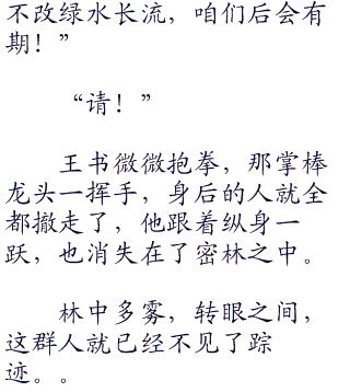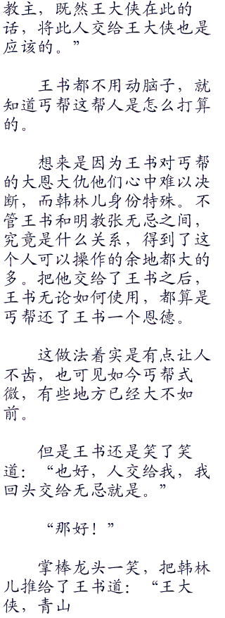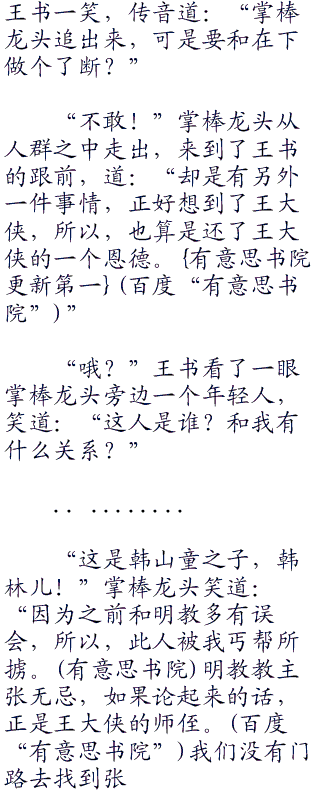 “因为我一不争天下,二不夺武林,为什么要和丐帮修好?”王书笑道:“单凭武功来说话的话,天下又有什么人是我的对手?我为什么要看别人的脸色做事?人间最难为的,就是快意恩仇,逍遥天下,既然我有这样的本事,为什么一定要委屈自己?”