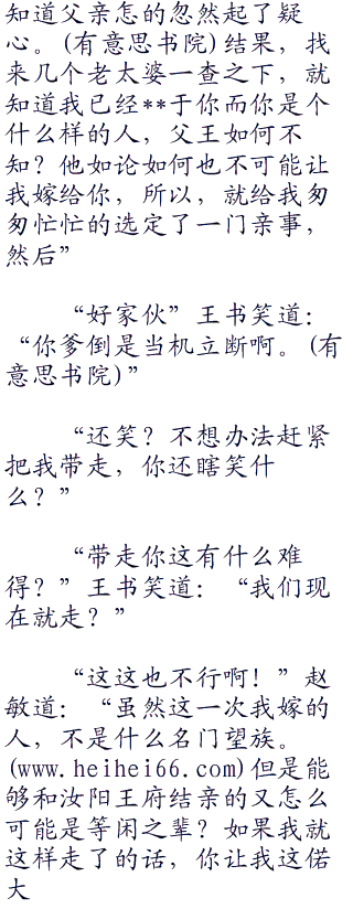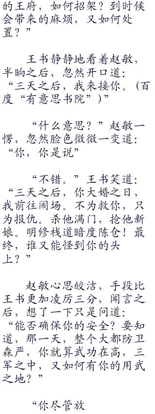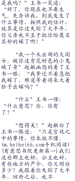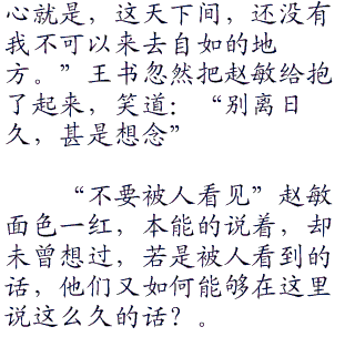 “以你的速度脚程,纵然是峨嵋距离大都远隔千山万水,也早该到了。”赵敏看着王书道:“你越是不来,我心中越是想念。我心中越是想念,就越是想的更加复杂,更加的乱。想着你和周芷若一路上亲亲我我,举案齐眉。想着想着我,我都恨不得自己立刻死了的好!”