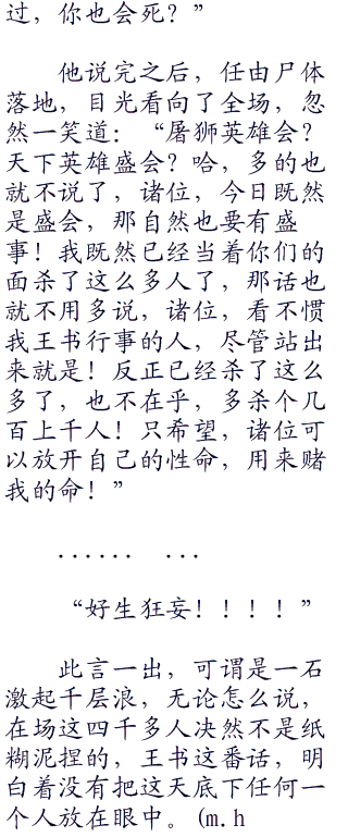 然而此时甚至没有谁敢去想这个问题,全场四千六百多人,如此庞大的人数,被这一剑震慑的,却是一语不能发,他们静静地看着王书,仿佛是在行一场莫名其妙的注目礼。仿佛这一刹那间,王书成为了无法形容的可怕巨人,站在这里,他就具备睥睨天下的资格。