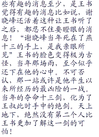 或许自己曾经在萧十一郎的事情,在陆小凤的世界中,只留下了一丝丝捕风捉影的传闻。但是当年自己在三少爷的剑中,燕十三一剑刺死了谢晓峰,而自己又一剑刺死了燕十三,当年这绝颠一战,必然会传承到现在。