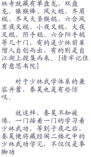 了空看向书架道:“秦施主,这第二层便是存放了我少林武功,共五百五十二门,你可随意观看,但不可带走,或是损毁。”