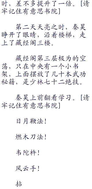 了空道:“秦施主,本寺的七十二绝技存放在藏经阁第三层,你看完第二层,自行上去便可,贫僧就不打扰你了。”