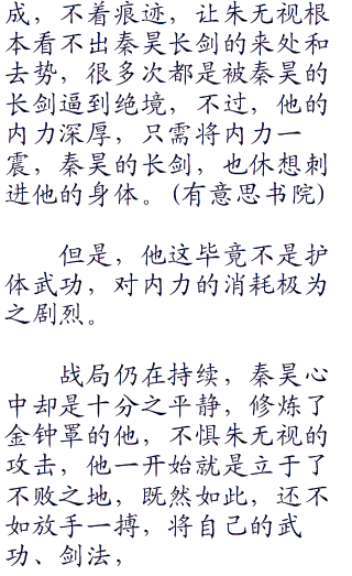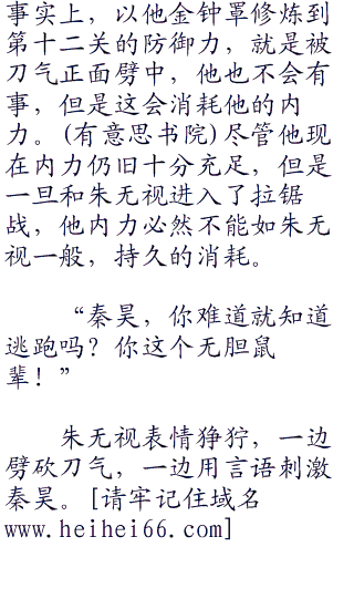 秦昊之前本来有六七十年内力,为了修炼金钟罩和铁布衫,消耗了不少,现在只剩余五十多年的内功修为,纵然在内力品质上,他要超出朱无视驳杂的内力,然而,朱无视的内力再驳杂,仍旧是大宗师品质的内力,在两三百年的总量面前,秦昊内力品质上的优势,便是显得微乎其微了。