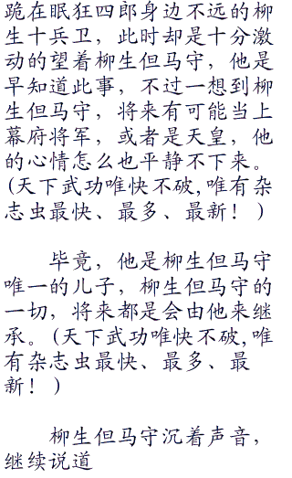 既然如此,眠狂四郎还不如尽自己的一份力量,免得整个武林内乱,平生浩劫。最主要的是他在帮助柳生但马守的同时,多少也能够对柳生但马守有所约束。