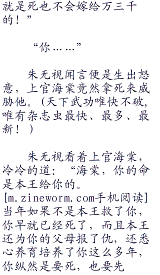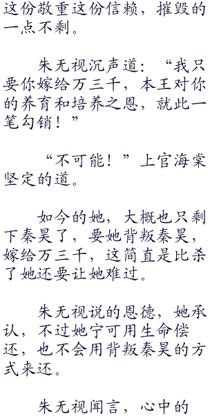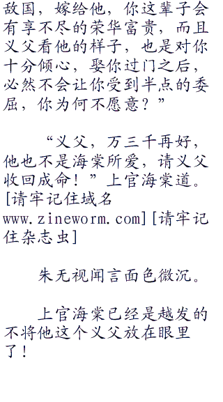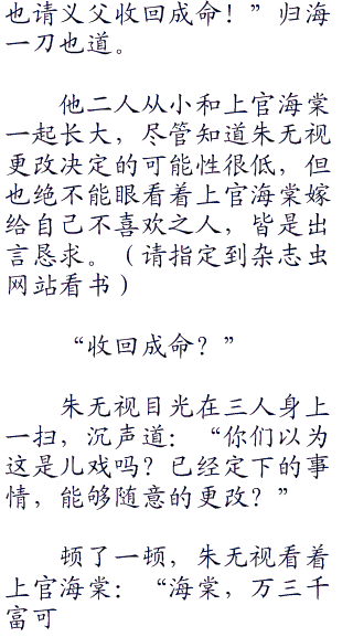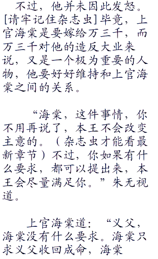 “不错,就是天大的好事。”朱无视道:“海棠,昨天万三千,万大官人来向义父提亲,想要迎娶你过16门,义父同意了,嫁给万三千,你也算是有了一个好的归宿。”
