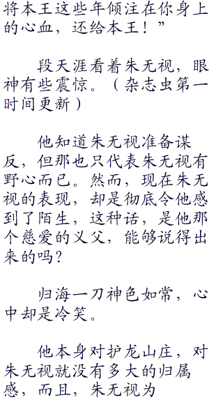当然,这是因为朱无视对她有养育和培养之恩,不过,她能做的,也仅有尊敬而已了,她不可能跟着朱无视一起谋反。