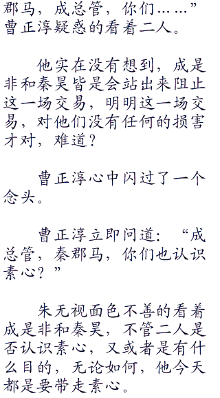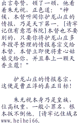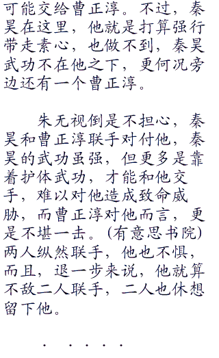 曹正淳要让朱无视见的不是别人,正是素心。若是朱无视动手想要强行带走素心,没有秦昊在一边镇压,他还真的不能放心。