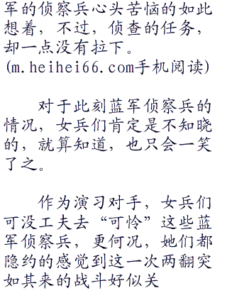 蓝军指挥官很郁闷,他演习打仗,从来没有像今天这么憋屈过,大好的机会让女兵们跑了不说,后续的追击竟然连女兵们的影子都没有看到,虽然是因为女兵们的能力太强的缘故,可是,在军中,作为精锐,说出去,只怕没几个人会相信。()