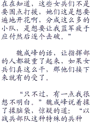 魏成峰苦笑道:“增员是肯定的,只不过我怕我们增员的部队没到,剩下的人就已经被女兵们给消灭了,而且,关键是我担心这是她们的计谋”