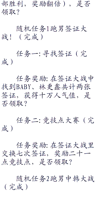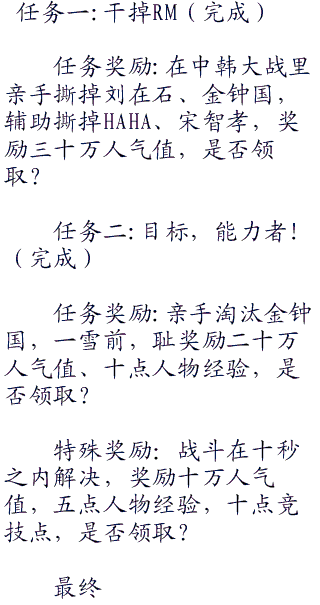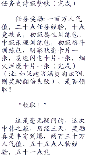 任务奖励:三十万人气值,十点人物经验,五点竞技点(上、下全
