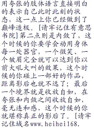 “普通人高兴时会大笑,她不会,她可能只是一个轻微的挑眉,嘴角一个小小的弧度;普通人愤怒时可能会大吼大叫,她不会,她可能又是一个挑眉,嘴角同样是一个弧度,和高兴时候的动作非常相似,但有一些微小的差别,就是这些差别给人的感觉就完全不同。