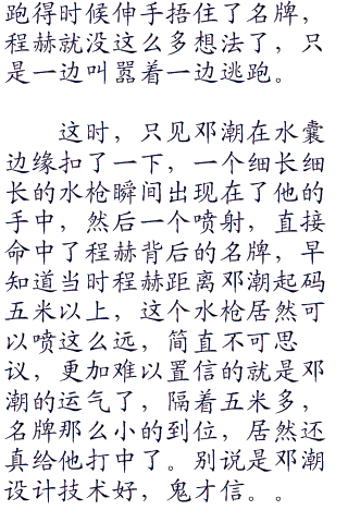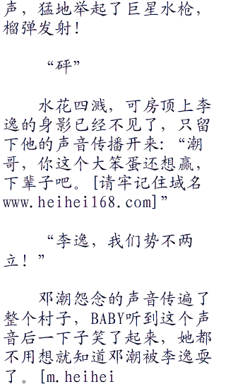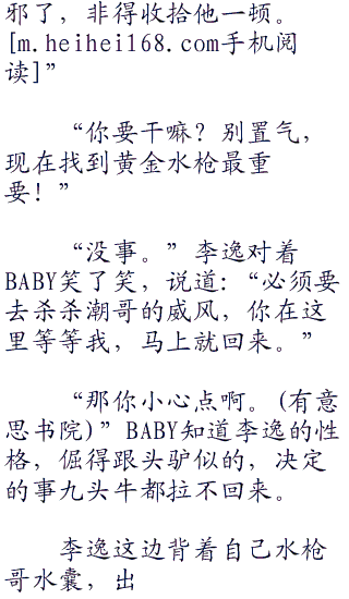 手机端着一把一米多的巨大水枪,正式baby之前用过的榴弹枪,两个手臂上更是绑着两把小型水枪,开关连接着巨大水枪的扳机,这还不算什么,他的脸上还套着一个透明的护罩,以保证不至于被水击倒得睁不开眼睛。