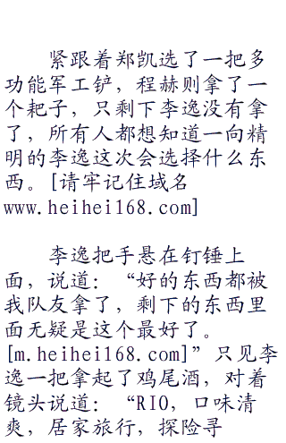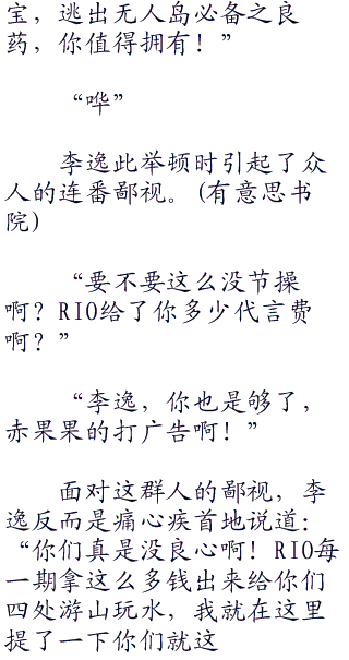 导演还没有说话,李逸就开口了:“逃离无人岛,逃嘛!凭节目组的水平,不就是搞点厚一点的墙或者深一点的坑让你去费点力气嘛,锄头、铲子,选这些东西肯定不会错的啦。”