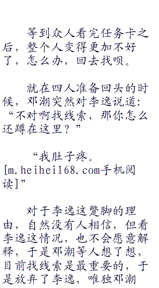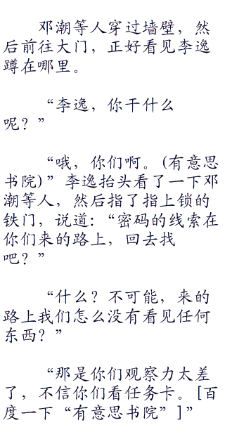 baby正准备捡起任务卡看一眼的时候,李逸突然说说道:“不用看了,肯定是让我们返回去寻找线索,在我们刚刚来的路上肯定有不少的线索可以分别得出四个密码。”