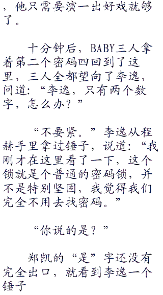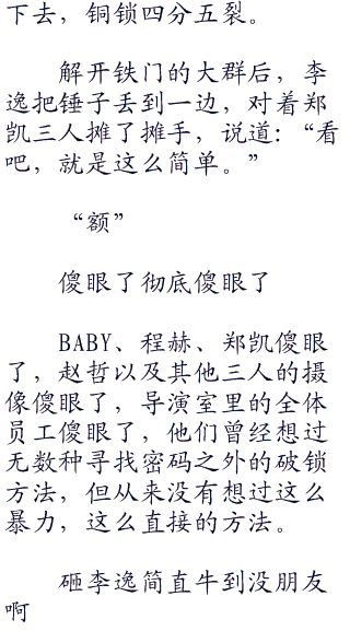 李逸这两个字颇有些小得意的味道,因为在通道的尽头是一道铁门,上面正挂着一把大锁。