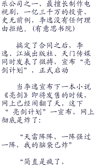 最开始李逸是准备年底开始连载《匹诺曹》的,正好为电视剧造势,但现在出了这档子事,让上面欠自己一个人情,多么珍惜的机会啊,李逸要是不把这人情扩大点,他就不是李逸了,所以他干脆选择把《亮剑》这部主旋律的神剧放出来。