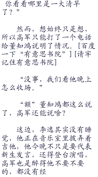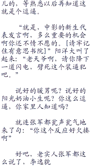 回到寝室,所有人都回来了,明天是中影的开学典礼,不管你多忙,都必须到场,这是中影的规矩,所以阳洋从千里之外的剧组赶回来了,《我的青春谁做主》的剧组只能把阿娜的戏放到一边,先拍没她的戏份,张军回来的时候嘴角带着淤青,本来李逸还在震惊是谁这么猛,把他打成这样了,结果张军一句“他起码得在床上躺个把月”就把李逸给撂倒了,张军的人生生猛至此,还需要说什么呢?