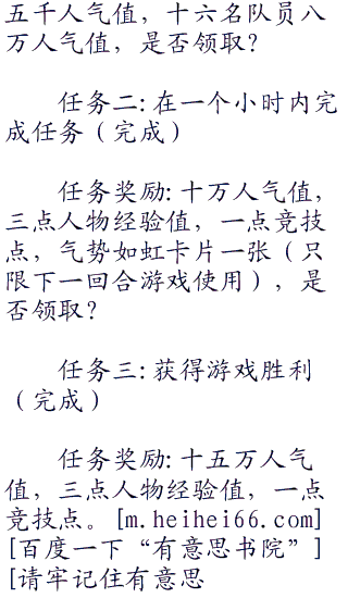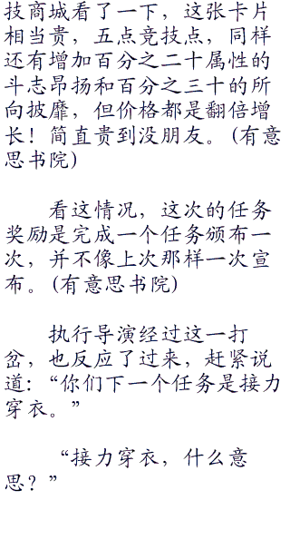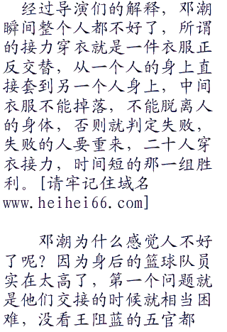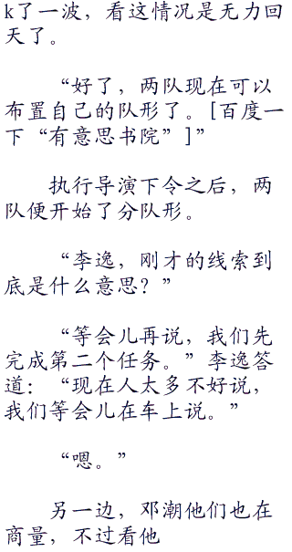 最终还是见惯“二六三”了大风大浪的邓潮第一个反应过来,拉着baby说道:“回来,回来。你这亏吃大了,凭什么让那臭小子占这么大便宜,什么破线索,我们不要了,我们自己赢。”说完邓潮就叫导演赶紧进行下一个任务。
