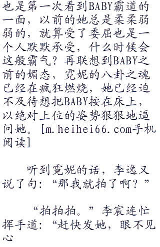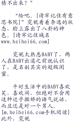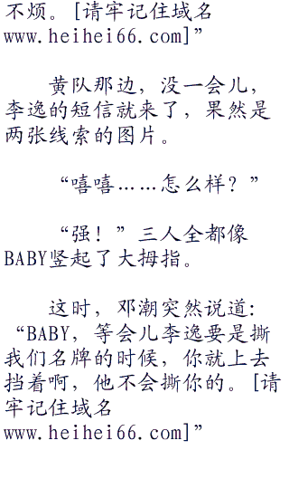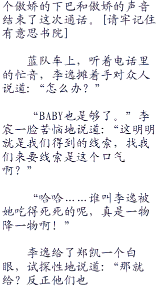 邓潮正准备说“李逸才不会给你”的时候,只听baby叫了起来:“不许拒绝,你要是敢拒绝,你就死定了!哼……”
