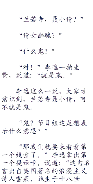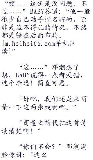 众人正苦恼的时候,baby突然掏出了手机,拨通了一个电话,说道:“李逸,把那两个线索拍张照片传过来。”