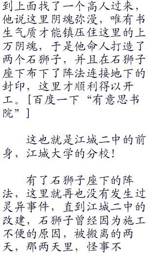 日本人投降之后,这里经常发生一些奇怪的形象,每到夜晚就鬼哭狼嚎的,甚至还有少看到在这座废弃的医院里有成千上万的人在聚会,他们唱歌、跳舞,和普通人无异,但一个个面色赤白,瞳孔放大,毫无生气。