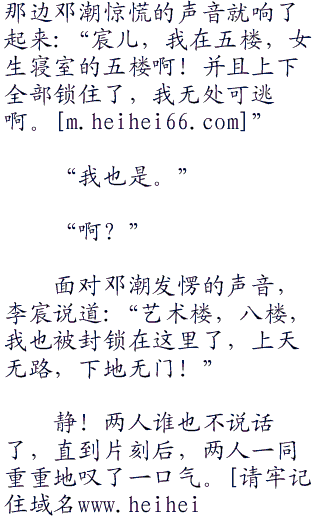李宸知道自己所在的是艺术楼,但具体的几楼他不知道,黑衣人离开之后,他开始四处乱逛,逛到楼梯口的时候,他发现上下楼梯全都被锁了,也就是说他出不去了,只能在这一层了。